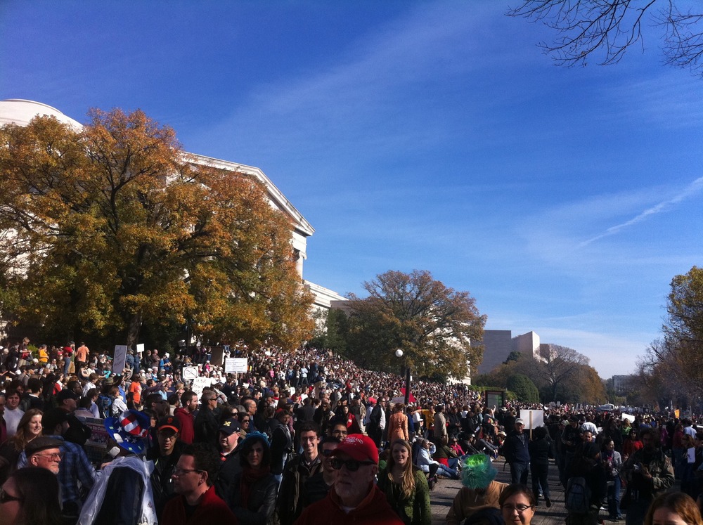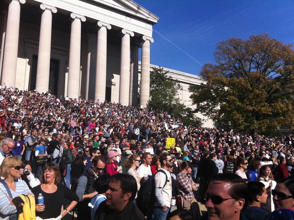 Stewart was raising a standard for how our alleged leaders should respect us so we could respect them in return. “Because the image of Americans that is reflected back to us by our political and media process is false,” he said. Stewart was doing nothing less than resetting the relationship of the powerful to the public. He was re-empowering us. His speech and his event were profoundly democratic. Not Democratic or Democrat–democratic.