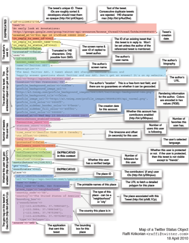 Back in 2010, the map of a tweet already looked like this under the hood, with some 30 lines of meta data.