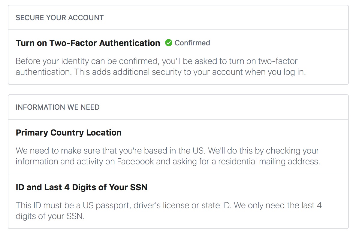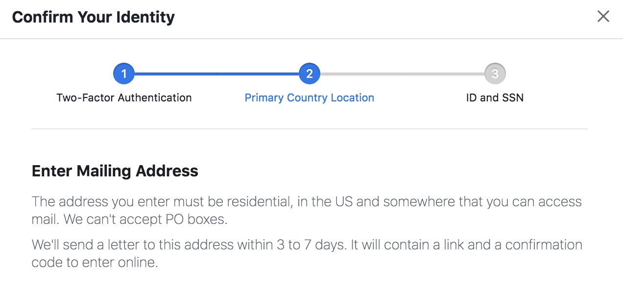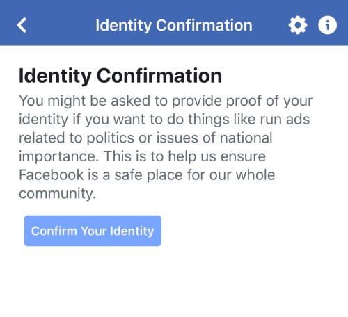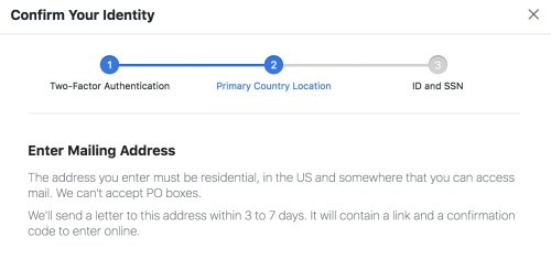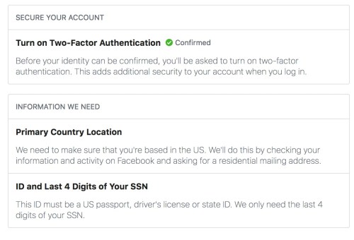 When I said the feature wasn’t available on mobile, he told me to visit Facebook from a desktop computer to complete the process. When I did so, Facebook prompted me to enter a mailing address and upload images of my passport, driver’s license or state ID.