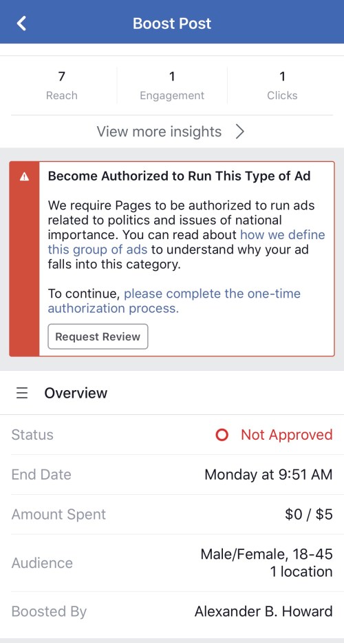 UPDATE: When I shared this on Twitter, Rob Leathern, the director of product at Facebook responsive for ads integrity and transparency, replied to my @mention, stating that “This is not blocked – this is an ad about an issue of national importance and so requires you to go through the authorization process, before it will run.”