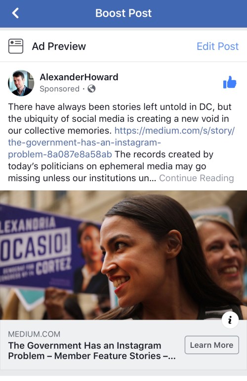 I shared the piece I wrote for Medium about the need to preserve ephemeral updates by politicians & civil servants on my Page. I decided to experiment with boosting it.