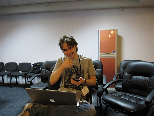 Kutcher (above, in his own Twitpic) evidently has gained some perspective, at least on the impact of state involvement. “My perception of Russia and Russian technologists was always based on Russia’s ability and interest in scientific achievement,” he said. “The one thing I’ve found since we’ve been here, without Russian government controlling the room, is that it becomes a much more vibrant, expressive room. My perception of control levels and the reality were two different things.”